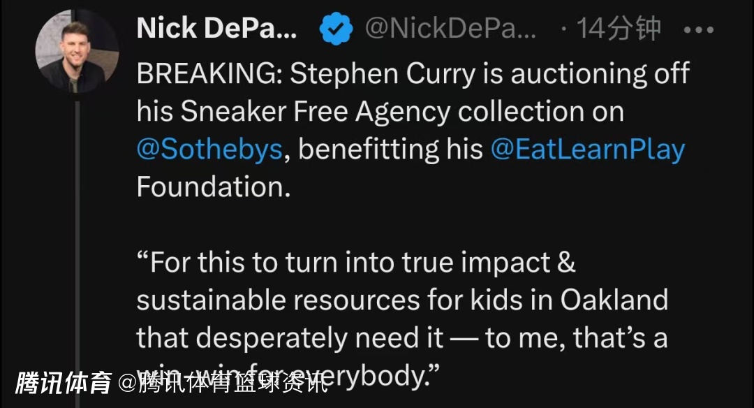 2026-04-08 08:00北京时间4月8日,据知名球鞋记者、《SLAM》及ESPN专栏作家尼克-德保拉报道,勇士球星库里将拍卖本赛季“球鞋自由市场”期间所上脚的全部各品牌战靴,拍卖所得将悉数捐给他与妻子共同创立的Eat. Learn. Play.基金会。