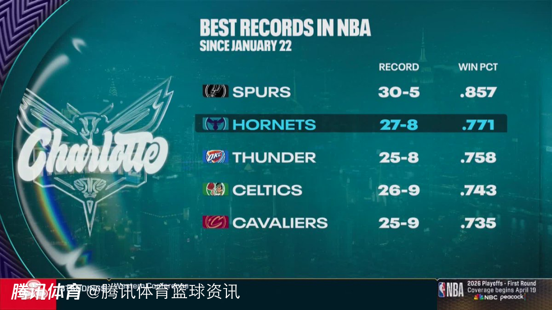 胜率77.1%!黄蜂1月23日以来战绩高居联盟第二 马刺同期居首