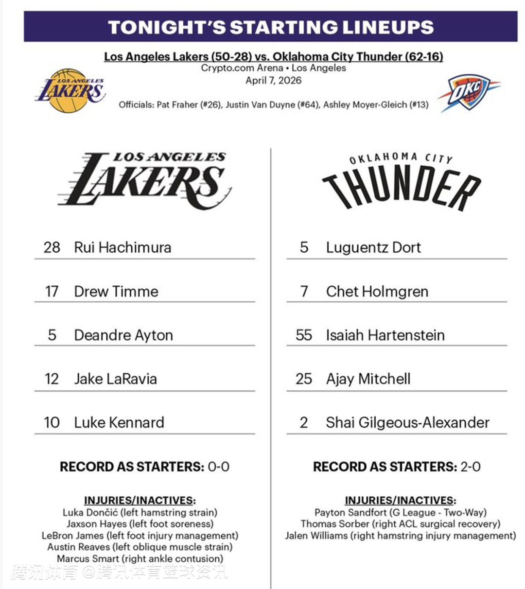 2026-04-08 10:20北京时间4月8日,今天上午10点30分,湖人主场对阵雷霆,赛前双方公布了本场比赛的首发名单。