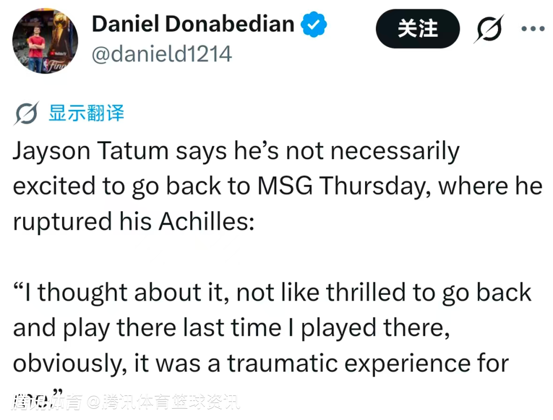 塔图姆表示,自己对于周五重返麦迪逊广场花园并无特别兴奋之感,去年他正是在此处遭遇了跟腱断裂:“我确实想过这事,但对于重回那里打球并没有什么激动的心情。显然,我上次在那里打球的经历,对我而言是一段创伤。”