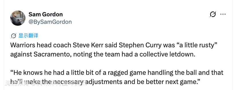 科尔:不确定库里是否出战与湖人一役 全队在这场比赛都有些松懈