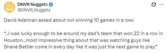 2026-04-09 08:40北京时间4月9日,NBA常规赛继续进行,掘金队对阵灰熊队。赛前,掘金队主教练小阿德尔曼接受媒体采访,谈到了掘金队冲击10连胜的话题,并回忆当年在老阿德尔曼身边见证火箭22连胜的经历。