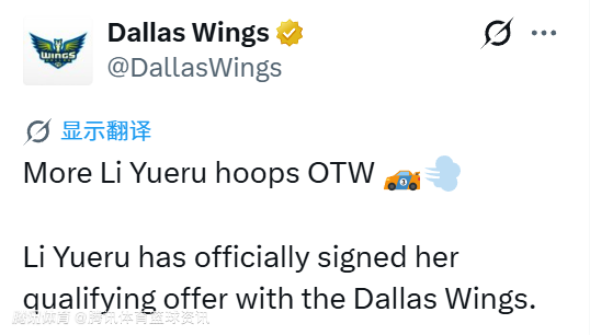 继续逐梦WNBA!官方:李月汝接受资质报价 重返达拉斯飞翼