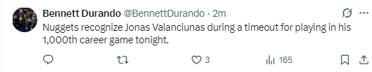 里程碑!瓦兰丘纳斯常规赛出战1000场 掘金主场致敬