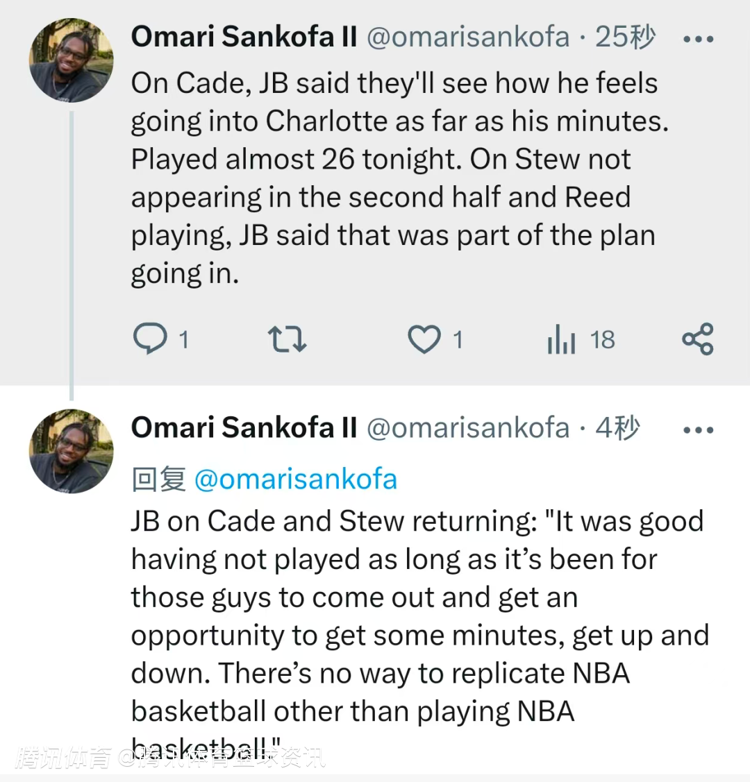 谈及坎宁安和斯图尔特复出,比克斯塔夫表示:“这两位球员缺阵了很长时间,能重新登场获得出场时间、适应比赛节奏,这是件好事。想要找回NBA比赛的感觉,没有任何方式能替代真正上场打球。”