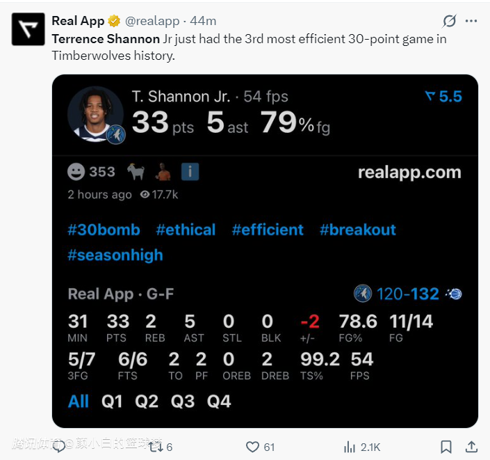 7.香农也是森林狼队史效率第三高拿到30+的球员;