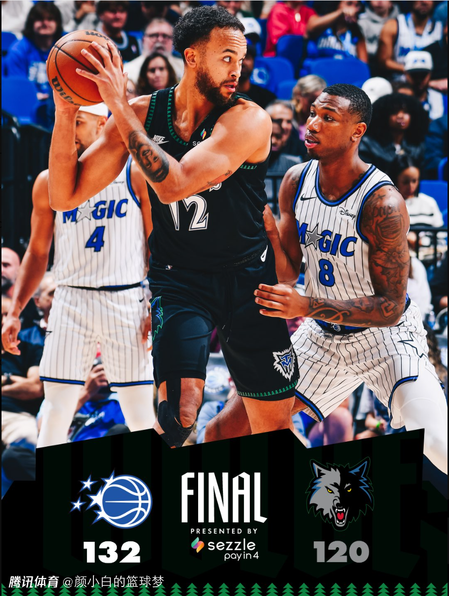 2026-04-09 11:20北京时间4月9日,NBA常规赛,森林狼120-132不敌魔术,这场比赛是森林狼背靠背第二场,所以爱德华兹、戈贝尔、兰德尔、多森姆、康利都轮休,这场比赛之前森林狼就已经锁定了季后赛席位。