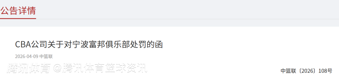 2026-04-09 17:10北京时间4月9日,CBA官方公布了对宁波男篮的罚单,对宁波富邦俱乐部处以核减联赛经费人民币3万元的处罚。