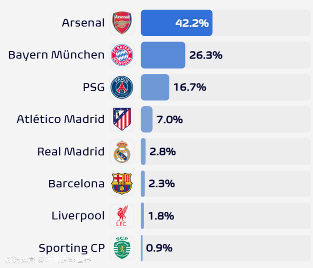 欧冠夺冠概率:阿森纳42%一骑绝尘 拜仁第2 皇马仅2.8%