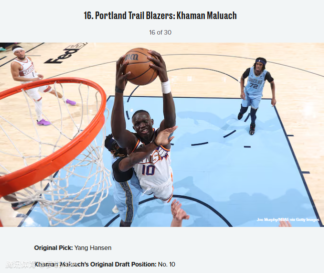 中国球员杨瀚森原本是在第16顺位被开拓者选中,而在美媒的这份首轮重排中,他的名字并不在其中。谈及开拓者的第16顺位,该美媒列出的球员是杨瀚森的好友马鲁阿奇。马鲁阿奇原本是这届选秀的第10顺位。相关解析如下——