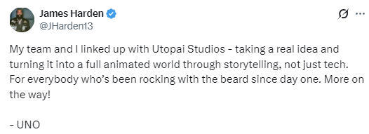 哈登在个人社交媒体上写道:“我和我的团队联手了Utopai Studios,我们并非只依靠技术,而是通过叙事手法,将一个真实的创意打造成了一整个完整的动画世界。致所有从一开始就一直支持这位大胡子的朋友们。更多精彩,敬请期待!”