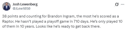 此外,凭借本场比赛的38分,英格拉姆还创下了一项新纪录,本赛季他已经代表猛龙队砍下了1614分,超越迈克-詹姆斯(1604分)和莱昂纳德(1596分),成为了猛龙队历史上效力球队首个赛季得分最高的球员。
