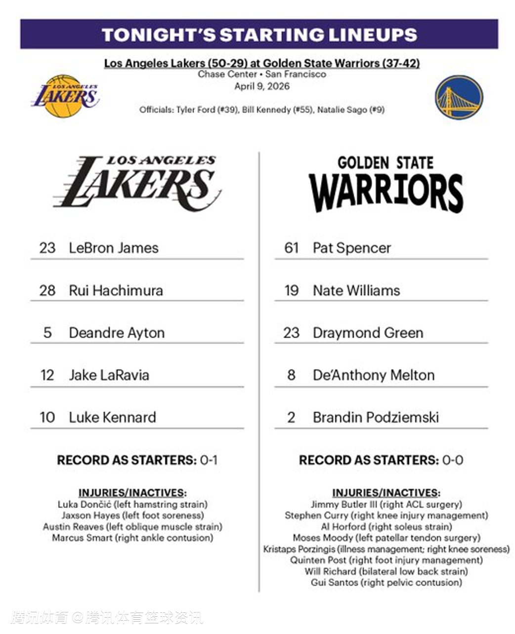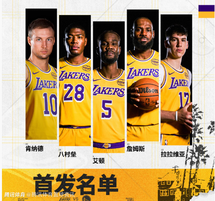 2026-04-10 09:50北京时间4月10日,NBA常规赛,湖人客场对阵勇士,赛前双方公布了本场比赛的首发阵容。