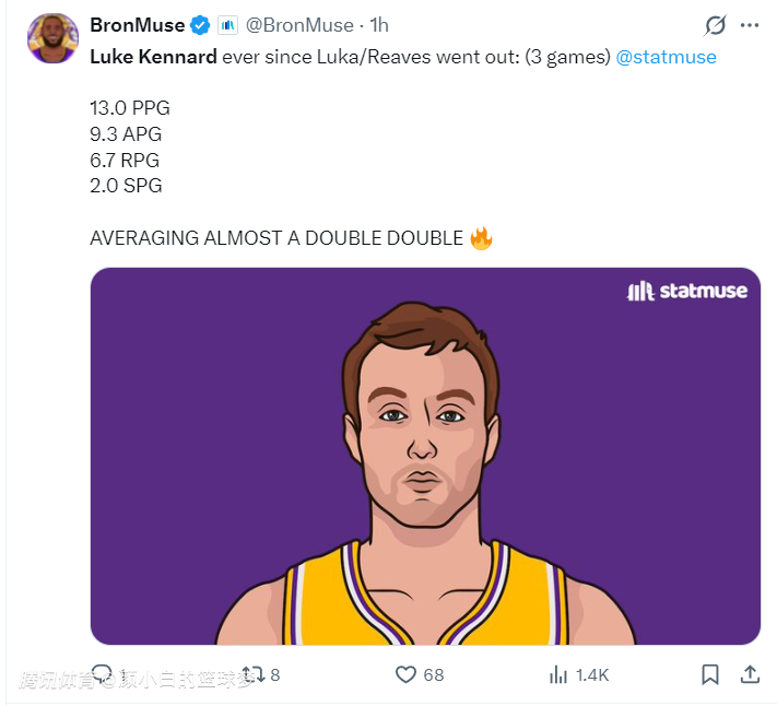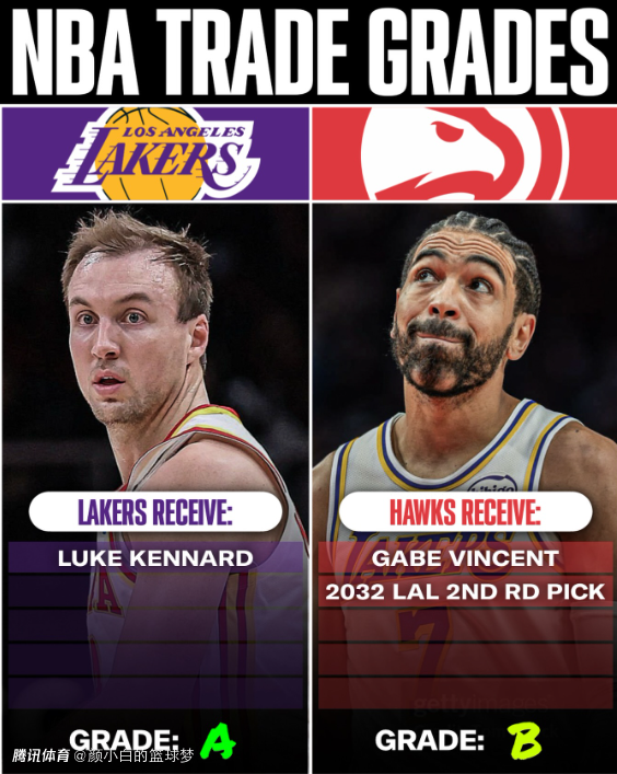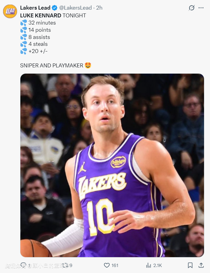 肯纳德是湖人在交易截止日用文森特+1个2032年的湖人次轮签从老鹰换来的,随后交易评级湖人A,老鹰B,肯纳德常年保持三分球命中率45%以上,他是湖人最需要的投手,但没想到在东契奇、里夫斯缺席的情况下他还能客串一号位。