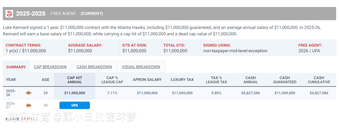 肯纳德本赛季年薪为1100万,今夏他的合同就要到期,按照他目前的表现来看今夏湖人肯定会续约他,再拿一份千万长约毫无问题。