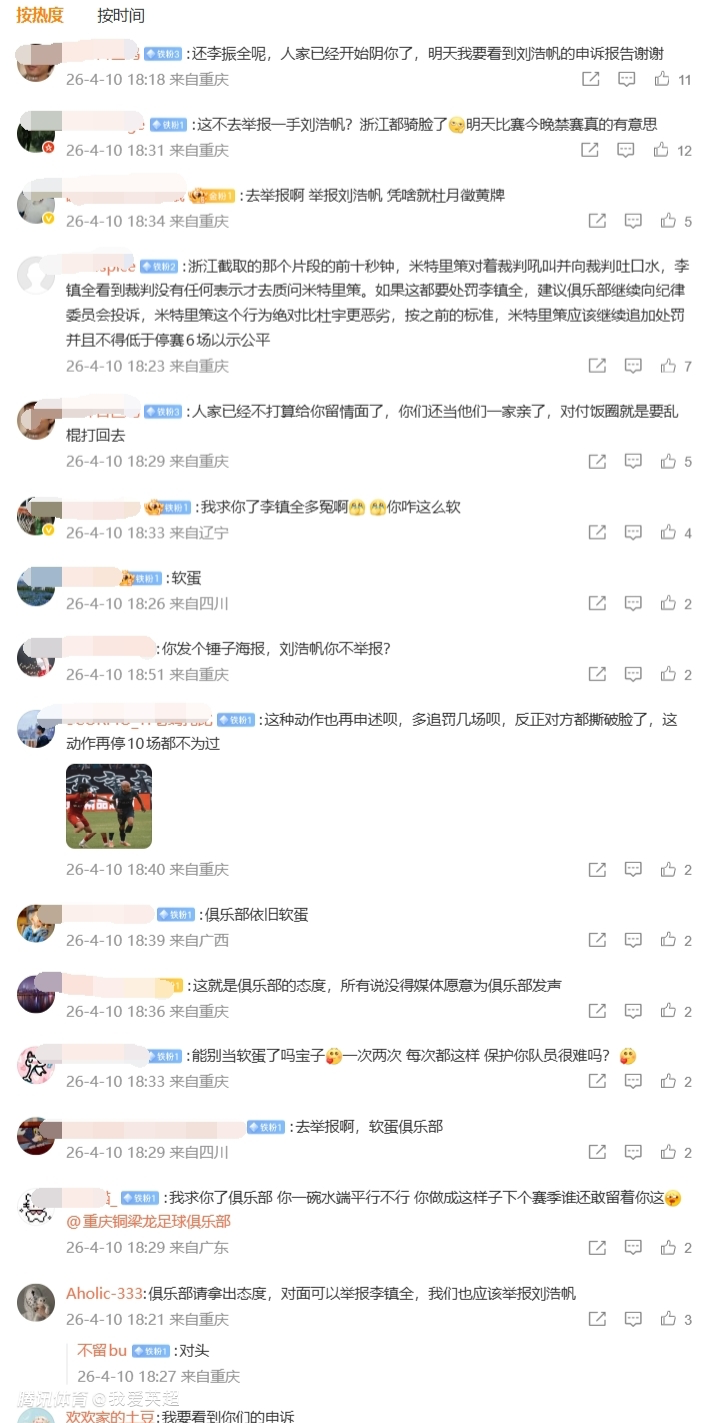 部分重庆球迷评论表示,浙江球员刘浩帆也有骂人的举动:“我们应该反手举报刘浩帆!”;“我要看到俱乐部的申诉!”;“还有心情发什么海报?刘浩帆你不举报吗?”