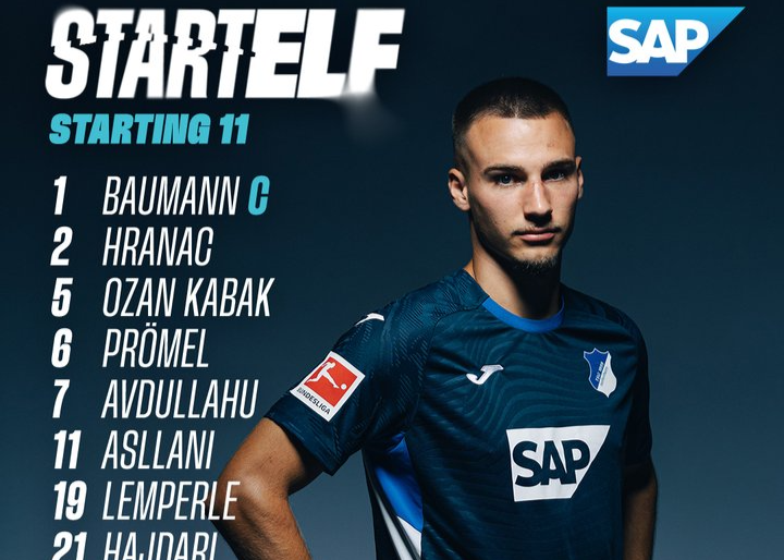 霍芬海姆首发阵容:1-鲍曼、5-卡巴克、21-哈吉达里、2-赫拉纳克、27-克拉马里奇、34-曹法尔、6-普罗梅尔、7-阿夫杜拉胡、29-图雷、19-伦珀尔、11-阿斯拉尼
