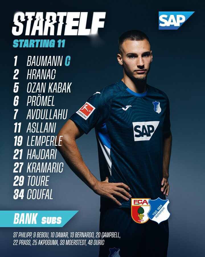 霍芬海姆替补阵容:37-菲利普、25-阿克波古马、13-贝尔纳多、22-普拉斯、48-朱里奇、10-达马尔、9-贝博、20-坎贝尔、33-莫尔斯特德