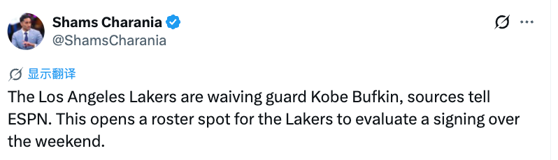 2026-04-11 02:20北京时间4月11日,据Shams报道,湖人已经裁掉科比-巴夫金,这样一来,球队腾出了一个阵容名额,球队将会在本周末评估后续的签约操作。