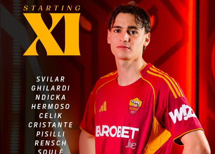 罗马首发阵容:99-斯维拉尔、22-埃尔莫索、5-恩迪卡、87-吉拉迪、4-克里斯坦特、7-佩莱格里尼、19-切利克、2-伦施、18-苏莱、61-皮西利、14-马伦
