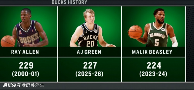 其四,格林本赛季227记三分升至雄鹿队史第二位。