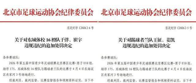 4月9日,北京市足协纪律委员会处罚通报显示:4月4日,2026年第五届中国青少年足球联赛北京赛区男子U10组第3轮,B组的踢球者兰队对阵东城体校16橙队比赛中,下半场踢球者兰队连续射入本方球门3球,随后东城体校16橙队连续射入本方球门2球,两队守门员均未进行有效的扑挡。