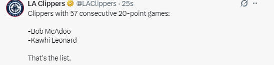 连续57场20+!莱昂纳德追平麦卡杜 并列快船队史第一