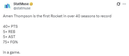 根据数据统计显示,阿门还是火箭队过去40个赛季以来首位单场至少40分5篮板5助攻且投篮命中率75%+的球员。