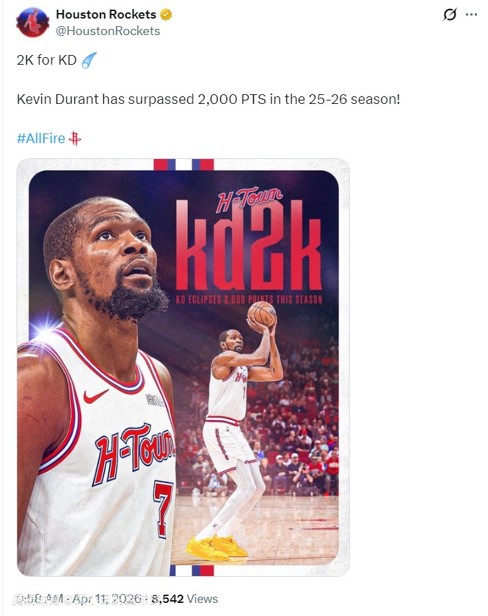 杜兰特本赛季完成2000分里程碑,超越卡尔-马龙成为NBA历史上年龄最大单赛季2000分的球员。