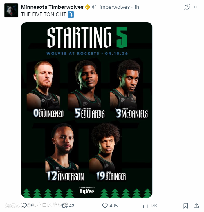 此役森林狼依旧多人伤停:戈贝尔、里德、海兰德、兰德尔;