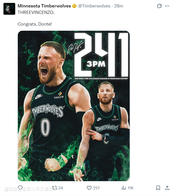 迪温琴佐迎来里程碑,他本赛季已经命中241个三分球生涯新高。