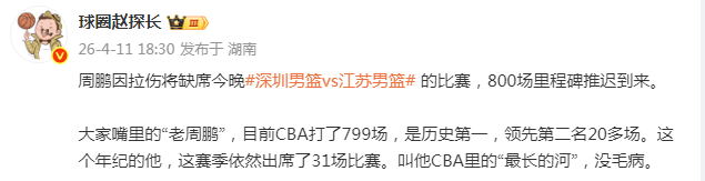 2026-04-11 19:40媒体人赵探长透露,深圳男篮老将周鹏因为拉伤将缺席今晚和江苏男篮的比赛,出战800场的里程碑也将因此推迟。