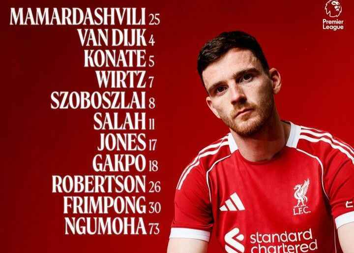 利物浦首发:25-马马尔达什维利、30-弗林蓬、4-范戴克、5-科纳特、26-罗伯逊、8-索博斯洛伊、17-琼斯、7-维尔茨、11-萨拉赫、18-加克波、73-恩古莫哈