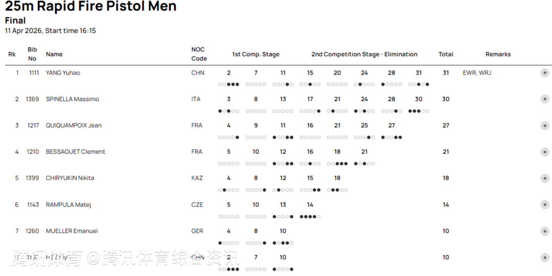 2026-04-11 23:40北京时间4月11日,射击世界杯(步手枪)西班牙站结束男子25米手枪速射比赛。20岁的中国选手杨宇浩尽管在第一组只有2中,但顶住压力在后面的比赛中稳扎稳打不断提升位次,在倒数第二组追至并列第一,并最终以31中平世界纪录的成绩夺得冠军,也是个人首个世界杯冠军。