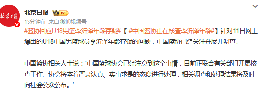 中国篮协:已注意到李沂泽年龄存疑 调查和处理结果将向社会公布