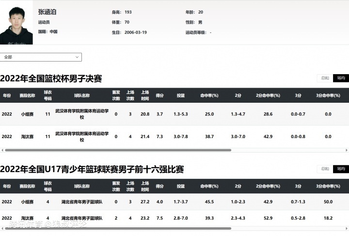 网友晒出了两人的参赛信息,张涵泊,2006年生,湖北青年男篮、武汉体育学院附属体校球员,2021-2022年U15/U17赛事参赛。