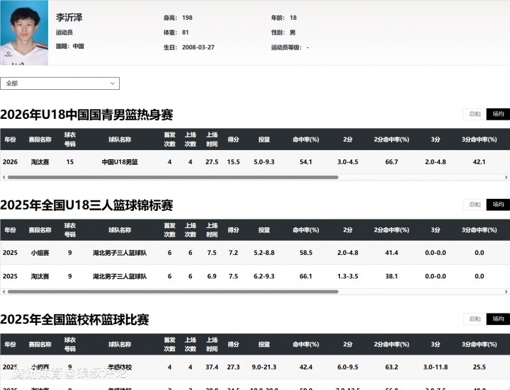 2005年出生的杨瀚森,19年跟随淄博体校征战U15,21、22年U17,22年U18亚锦赛,23年U19世界杯都是有清晰比赛记录在册的。23-24赛季、24-25赛季杨瀚森在经过2个赛季的CBA征战之后,于2025年开始冲击NBA,如今已经在NBA度过了一个完整的2025-26赛季。