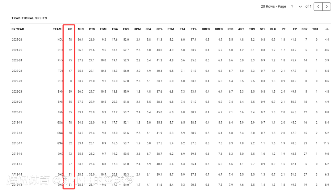 杜兰特上一次单赛季打至少78场比赛好要追溯到17-18赛季,也就是30岁的杜兰特,那个赛季他场均34.6分钟,26分6.4篮板5助攻0.7抢断1.1盖帽,命中率52.1%,三分命中率35.3%,登场时间还不如37岁的他,效率也不如37岁的他。