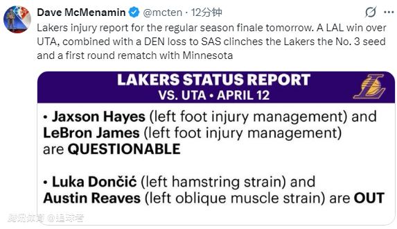 湖人官方公布收官日对阵爵士的伤病报告,詹姆斯出战成疑,东契奇和里夫斯都因伤继续休战。