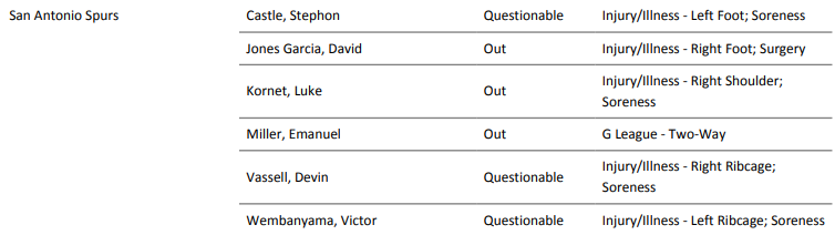 马刺公布伤病报告——文班亚马(右肋骨挫伤)、瓦塞尔(右胸腔酸痛)和卡斯尔(左脚酸痛)都出战成疑,50%出战可能性;科内特(右肩酸痛)确定休战;福克斯、约翰逊、哈珀、巴恩斯等球员都不在伤病名单上,换言之,他们都可以出战。