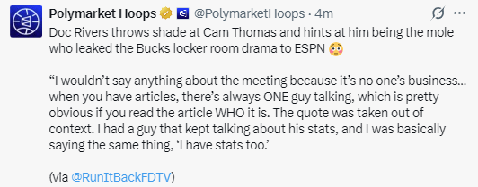 2026-04-12 09:40北京时间4月12日,雄鹿队主教练里弗斯在参加节目时暗讽卡姆-托马斯,并暗示他就是将雄鹿更衣室风波泄露给ESPN的内鬼。