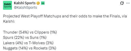 该媒体预测,西部季后赛的首轮对阵为雷霆vs快船,马刺vs太阳,湖人vs森林狼,掘金vs火箭。发生上述对阵的前提为湖人队常规赛收官战取胜且掘金队输给马刺队,太阳队在7/8名附加赛中取胜,快船队在8/9名附加赛中取胜。