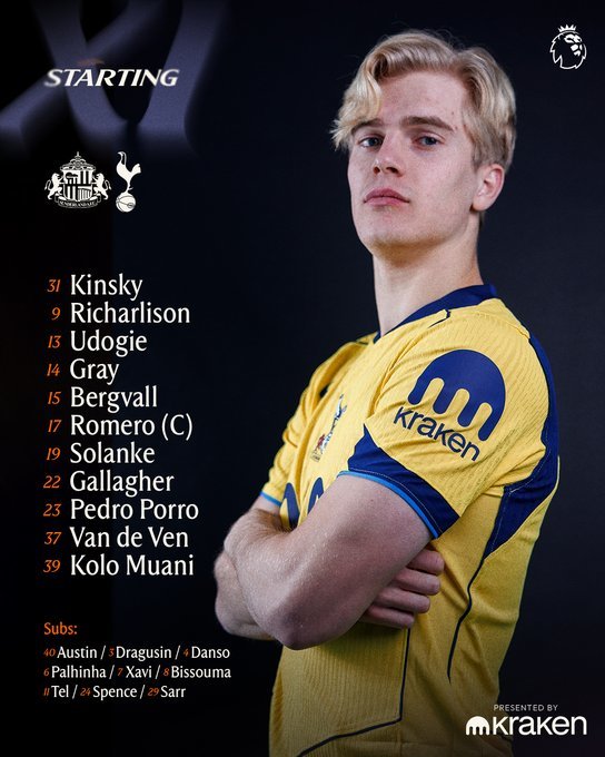 热刺首发:31-金斯基、13-乌多吉、17-罗梅罗、23-波罗、37-范德芬、14-格雷、15-贝里瓦尔、9-里沙利松、19-索兰克、22-加拉格尔、39-穆阿尼