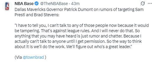 此前,有媒体称杜蒙特已接触业内顶尖高管,名单包括普雷斯蒂、史蒂文斯、康奈利和奥尔特曼,杜蒙特否认了这一消息,他表示:“我必须说明,我现在不能和这些人有任何接触,否则会被认定为违规引诱,这违反联盟规则,我绝对不会这么做。但我们会踏实做好工作,找到真正优秀的领导者。一位能打造优秀球队文化、拥有亮眼履历、懂得培养年轻球员的人,我们需要一位卓越的领导者,一位能塑造正确球队文化的人。”