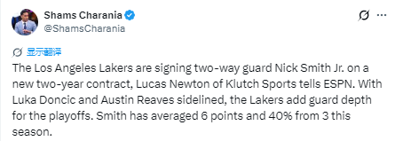2026-04-13 00:00北京时间4月12日,据名记Shams报道,Klutch Sports公司的经纪人卢卡斯-牛顿向ESPN透露,洛杉矶湖人将与双向合同后卫小尼克-史密斯签下一份为期两年的新合同。