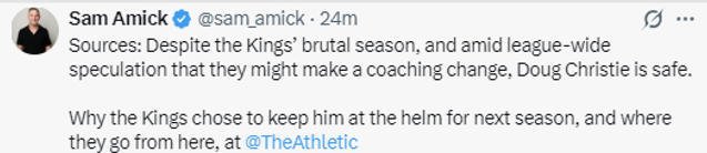 此前外界认为克里斯蒂会在赛季结束后下课,但国王管理层认为,球队战绩糟糕是因为阵容太差且主力球员接连受伤,他们认为克里斯蒂理应获得更多时间证明自己的执教能力,所以决定让克里斯蒂在下赛季继续执教,并将持续对其进行评估。