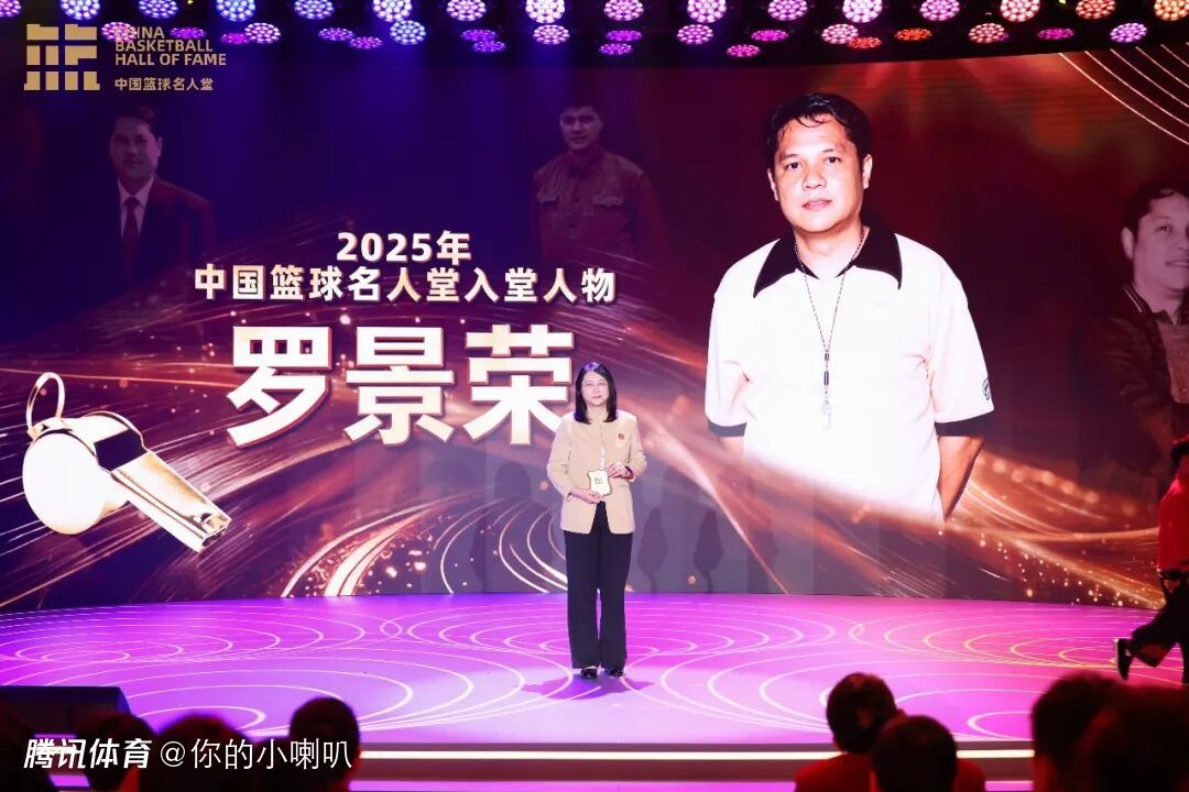 罗景荣是新中国第一批国际级裁判员之一,曾执裁过1978年世锦赛、1984年洛杉矶奥运会等多项国际大赛,是我国执裁国际顶级篮球赛事次数最多的裁判员之一。罗景荣之女罗向东代父亲登台领取了名人徽章。