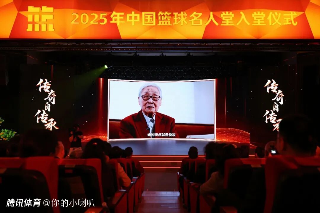李少芬是新中国第一批中国女篮队员,因年事已高无法亲临现场。仪式上,她通过视频回顾了自己13载的国家队生涯,介绍了中国女篮建队初期的奋斗历程。仪式现场,李少芬之女钟惟月代母亲登台领取了名人徽章。