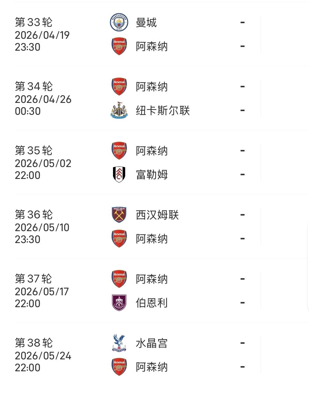 在两队互相交手后,曼城和阿森纳都不会再在联赛面对BIG6,不过曼城最后一场要面对位居欧冠区内的维拉,如果末轮曼城和阿森纳依然在争冠,这场比赛无疑同样重要。