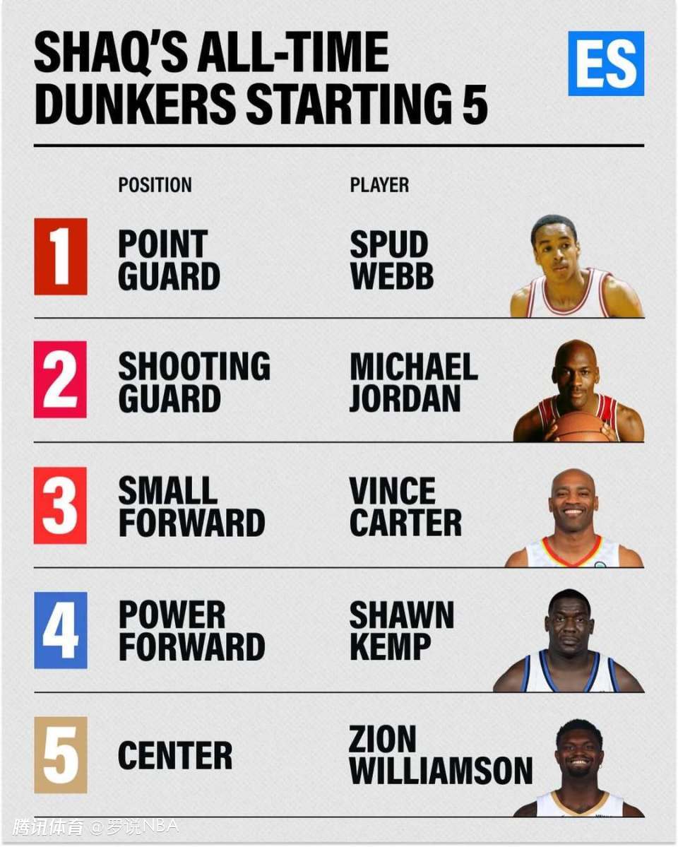最后一位是新奥尔良鹈鹕球星锡安-威廉姆森,也是这份名单里唯一现役球员。锡安的位置其实是前锋而非中锋,但奥尼尔依旧把他放在了五号位。他的扣篮极具统治力,却从未参加过扣篮大赛。这些年一直有不少人呼吁锡安参赛,可他始终没有答应。不过他才25岁,希望未来某天能看到他站上扣篮大赛的舞台。